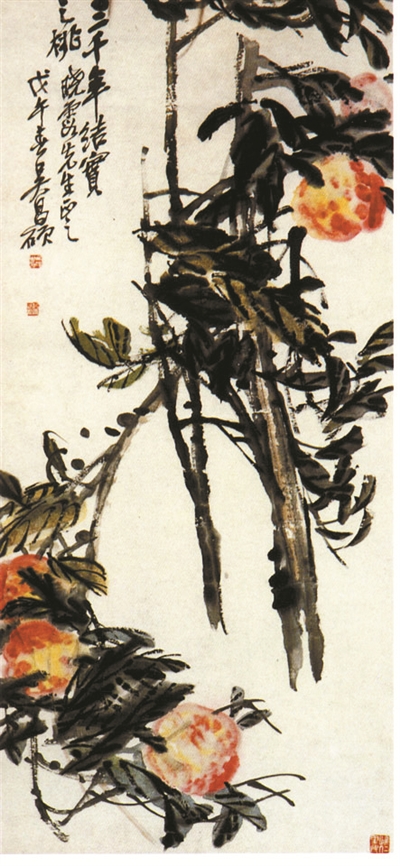 吳昌碩,原名俊,俊傾,字昌碩,別號缶廬、大龍、苦鐵等,浙江安吉人?!霸?、書、畫、印”四絕的一代宗師,與任伯年、趙之謙、虛谷齊名為“清末海派四大家”。《三千年結(jié)實(shí)之桃》,作于1918年。這幅作品運(yùn)用篆書筆法,疏闊縱放,雄渾有力,顯現(xiàn)出磅礴而茁壯的氣勢,筆力強(qiáng)悍,是吳昌碩大器晚成的絕佳寫照。