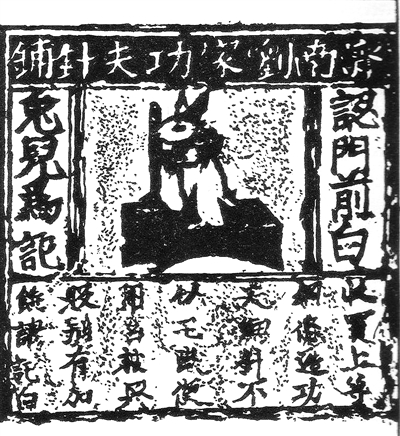 在中國(guó)國(guó)家博物館,陳列著一塊北宋年間“濟(jì)南劉家功夫針鋪”用來印刷廣告的銅雕版,其長(zhǎng)12.4厘米,寬13.2厘米,畫面正中是一只站立搗藥的白兔,左右注明“認(rèn)門前白兔兒為記”,這是在告訴買家“一定要認(rèn)準(zhǔn)本店的白兔搗藥商標(biāo)進(jìn)行選購(gòu)”;白兔下方廣告文辭稱:“收買上等鋼條,造功夫細(xì)針,不誤宅院使用。轉(zhuǎn)賣興販,別有加饒,謂記白”,意思是說:“我們家用最好的原材料,花費(fèi)功夫造針,使用方便。如果有人想批發(fā)轉(zhuǎn)買,還可以優(yōu)惠,但要告訴買者或注明是白兔牌的產(chǎn)品”。這件“濟(jì)南劉家功夫針鋪”銅雕版是已知世界上最早出現(xiàn)的商標(biāo)廣告實(shí)物。宋代使用銅版印刷的廣告,既可以做產(chǎn)品的包裝,也可以做廣告招貼的海報(bào)或者傳單,這種紙單在宋代叫“仿單”或“裹貼”。