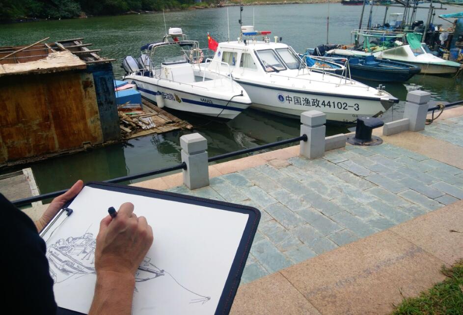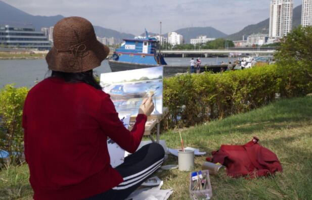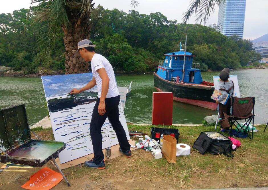優(yōu)美的景色映入畫家們眼簾,點燃了他們的創(chuàng)作激情。來到鹽田之后,藝術(shù)家們紛紛找好寫生地點,擺好畫架,迅速進入創(chuàng)作的狀態(tài)。他們當(dāng)中一部分來到了鹽田漁港,鹽田海鮮街后的小漁村避風(fēng)港。蔚藍的大海、旁邊的綠樹、避風(fēng)塘內(nèi)停泊的船只、白色的海鳥、釣魚的人以及遠方火熱的建設(shè)場景都呈現(xiàn)在畫家的筆端;另一部分藝術(shù)家來到了位于三洲田深圳會計進修學(xué)院的梧桐溪谷,小橋流水人家、奇石山林則一一被傾注于畫紙。