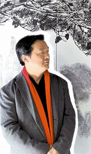 王和平說,指畫在美術大詞典里面能查得到的,起源于清初高其佩到高秉,再到“揚州八怪”一直到近代。而指書就更早了,明末傅山是寫指書的,但是指書沒有指畫傳承得好,寫指書比畫指畫難度大。王和平說:“我寫指書的目的是為了畫畫,指畫最大的弊病就是不能畫長線和塊面,所以我在指書方面學到的最大的經驗就是畫長線。對于手指畫山水畫,原來的老先生畫山水都要用毛筆輔助上色的。我在研究的課題中,對我最有幫助的就是我畫指畫不再用毛筆上色,而是直接用手指、手背、手掌上色,而且上色比較均勻,最后畫面呈現(xiàn)的味道我覺得比毛筆上色的味道更濃、更有成像感。”