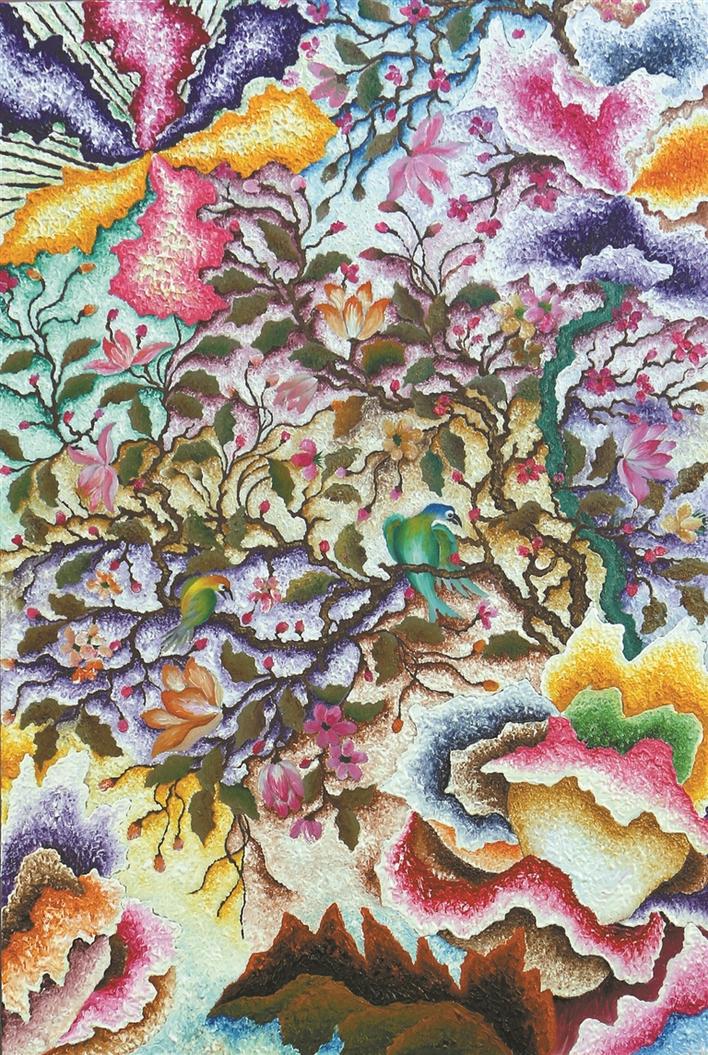 色彩是鄭澤生作品的一大亮點(diǎn)。這源自他第一份工作是在深圳增邦印花廠學(xué)調(diào)色,長(zhǎng)期的訓(xùn)練和刻苦的努力練就了他對(duì)色彩的敏感度。《消逝的香格里拉》這組作品可以說(shuō)是他近期創(chuàng)作中布局最為精細(xì)、顏色最為豐富的代表作之一。畫(huà)面布滿圖騰式的形象,萬(wàn)物共生。此時(shí)鄭澤生處理群像時(shí)顯現(xiàn)出一派欣欣向榮的景象,每一寸都散發(fā)著生命的光輝和絢爛。