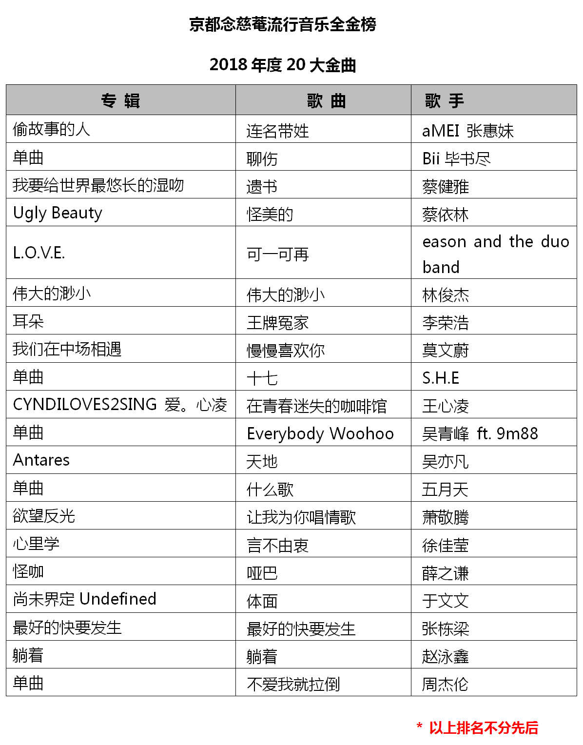憑著專輯《垂直活著,水平留戀著?!分鞔蚋枨禙orever Young》,在京都念慈菴·流行音樂全金榜榜單中霸榜十周的艾怡良,實力入圍“年度最受歡迎創(chuàng)作歌手”。除此外,毛不易、趙泳鑫、陳綺貞、蕭秉治、于文文、白安、王笠人均有入圍。
