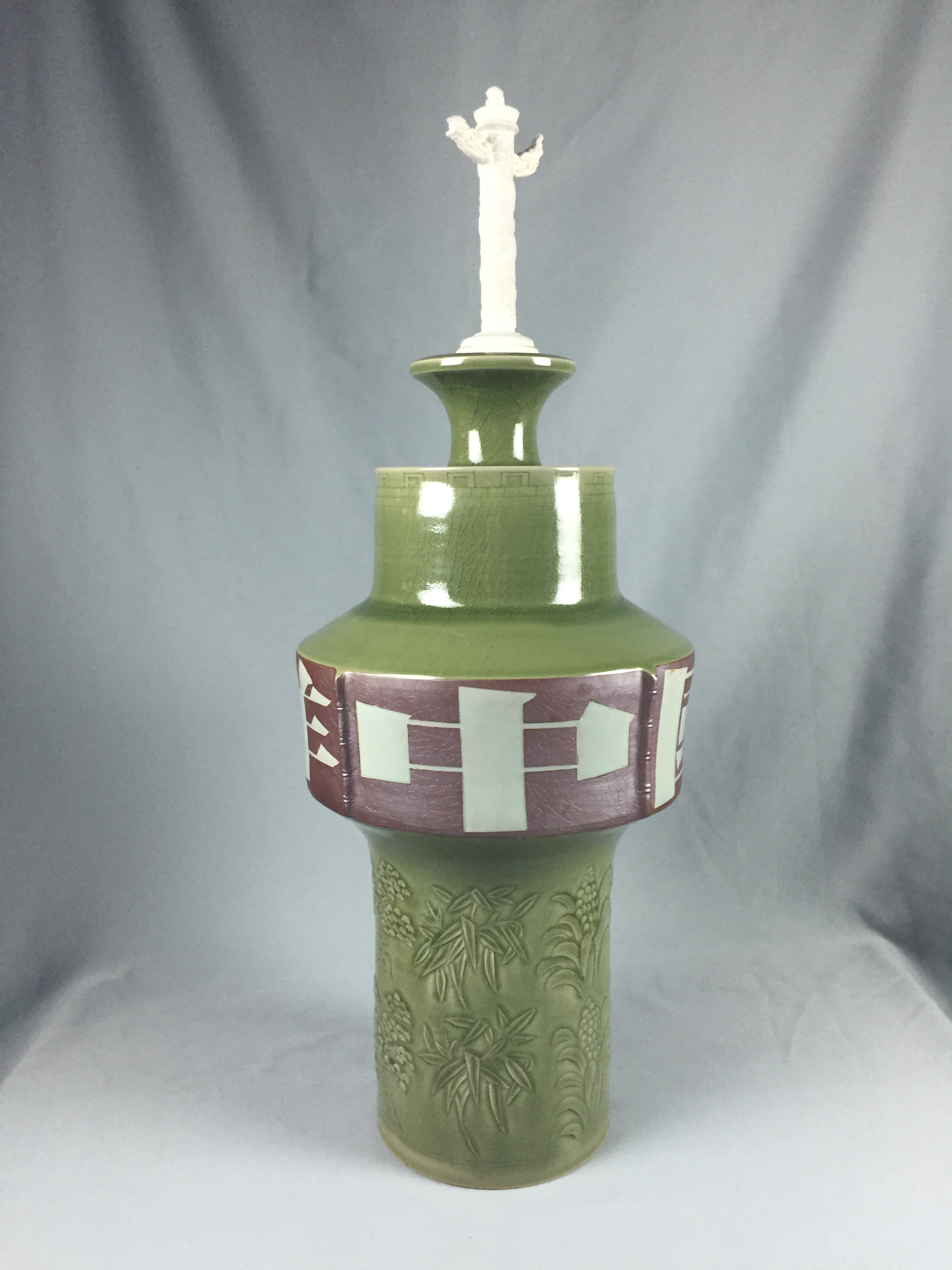 此次參與展出的青瓷作品中,一件名為“紅底玉縷耀瓷刻花松竹萬年青紋中國吉祥”的青瓷作品人氣頗高。據(jù)介紹,此件作品由中國工藝美術(shù)大師孟樹鋒親自制作。作品整體呈現(xiàn)“中”字造型,偉岸挺拔,雄渾方正,險(xiǎn)峻奇特而大氣磅礴。瓶頂一尊華表,白泥素胎,一如漢白玉石雕。瓶肩梢高凸又微微外撇,是一圈五十六個(gè)垛峰與垛口的萬里長城,代表著中國五十六個(gè)民族團(tuán)結(jié)一心。其下碩腹,則使用耀州紅底玉縷的工藝書寫“中國吉祥”四個(gè)雕版大字,點(diǎn)明作品主題。下部立柱上刻、劃、貼花的萬年青、青松、竹子,體現(xiàn)耀州瓷的風(fēng)格并以此祝福祖國。
