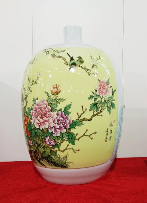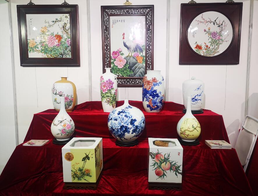 江西省陶瓷技能大師、江西省高級工藝美術(shù)師、惲派花鳥第十二代傳人、景德鎮(zhèn)青年陶瓷藝術(shù)家劉嘉鴻此次展會展出的陶瓷藝術(shù)作品共計35件,包含瓷板畫、瓷瓶、瓷盤、青花瓷、青花斗彩瓷等,其中《春滿園》、《錦堂富貴》、《長壽圖》等作品呈現(xiàn)陶瓷技藝,展示出劉嘉鴻深厚的藝術(shù)造詣。