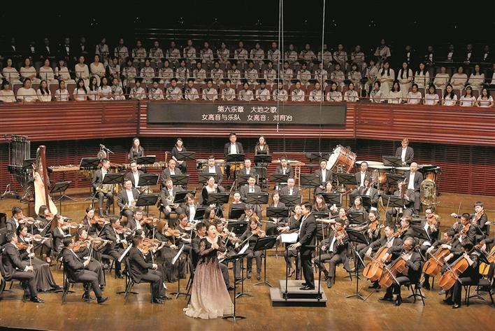 昨晚,大型交響套曲《我的祖國(guó)》奏響深圳音樂(lè)廳。圖為女高音歌唱家劉育冶傾情演繹《大地之歌》。