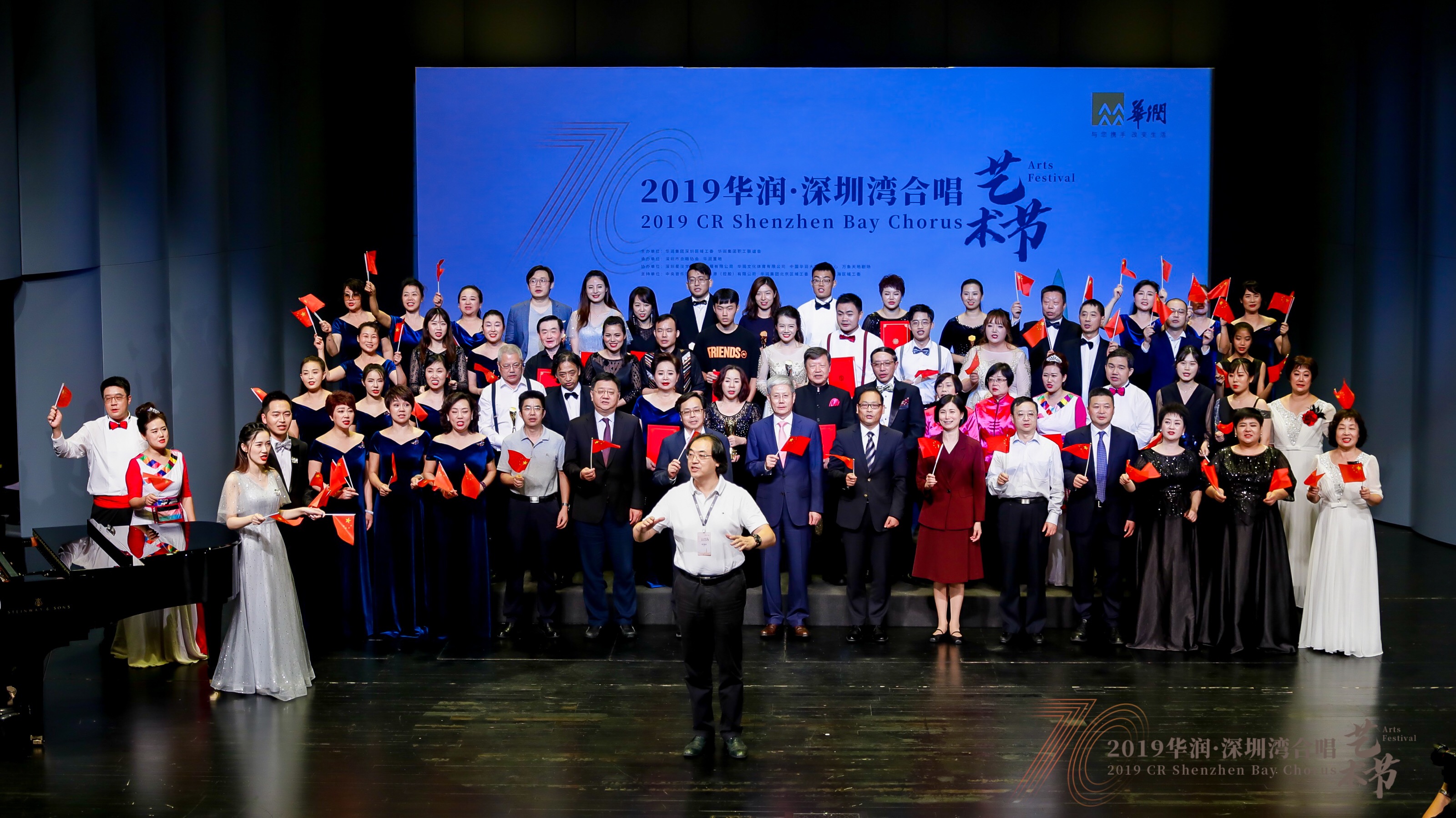 閉幕式最后,全場嘉賓觀眾一起走上舞臺,共同揮舞國旗,合唱《歌唱祖國》,為新中國70周年華誕獻上誠摯的祝福。