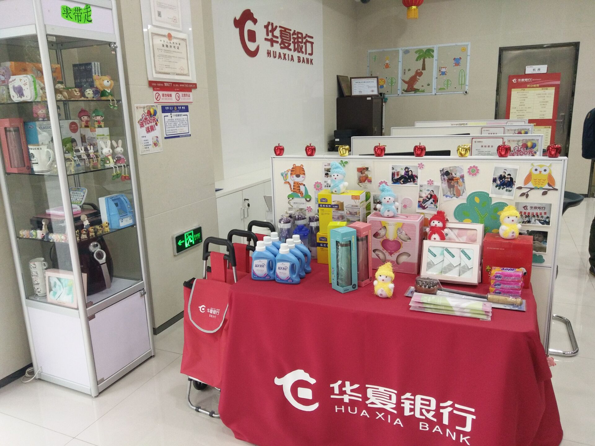 這是銀行?在記者走進這家銀行的門店時,有些遲疑。進門口陳列著一件件精美的禮品,“求帶走”的小標語,閃閃惹人愛,環(huán)顧下四周,確實是銀行的辦公柜臺,網(wǎng)點雖小,但五臟俱全,與其說是銀行,這里的整體布局更像是一個溫馨、充滿童趣的小家。