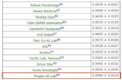 5月9日,國(guó)際權(quán)威人臉識(shí)別數(shù)據(jù)庫(kù)LFW(Labeled Faces in the Wild)最新公布的測(cè)試結(jié)果顯示,平安集團(tuán)旗下平安科技的人臉識(shí)別技術(shù)以99.8%的識(shí)別精度和最低的波動(dòng)幅度領(lǐng)先國(guó)內(nèi)外知名公司,位居世界第一。該精度為L(zhǎng)FW所公布的最佳成績(jī),也是平安科技人工智能實(shí)驗(yàn)室取得的里程碑式成果。此外,經(jīng)國(guó)家公安部第三研究所認(rèn)證中心權(quán)威認(rèn)證,平安科技人臉識(shí)別技術(shù)同樣獲得識(shí)別精度99.84%的檢測(cè)結(jié)果,并榮獲檢測(cè)報(bào)告證書。