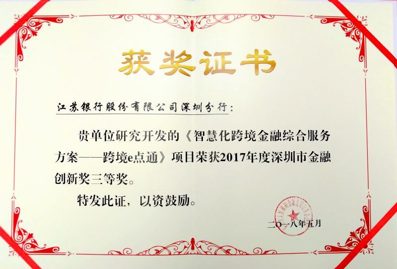 深圳新聞網訊 日前,深圳市政府2017年度金融創(chuàng)新獎評選結果揭曉,江蘇銀行深圳分行“智慧化跨境金融綜合服務方案—跨境e點通”項目斬獲三等獎,這是該行連續(xù)四年獲得金融創(chuàng)新獎后再次獲此殊榮,該行也由此成為深圳地區(qū)唯一一家五次榮獲金融創(chuàng)新獎的城商行。
