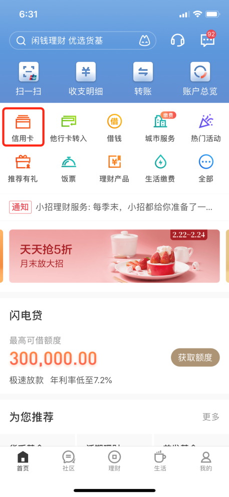 打開招商銀行App,在首頁點擊“信用卡”進入信用卡界面,點擊“還款”根據(jù)提示即可在線還款。
