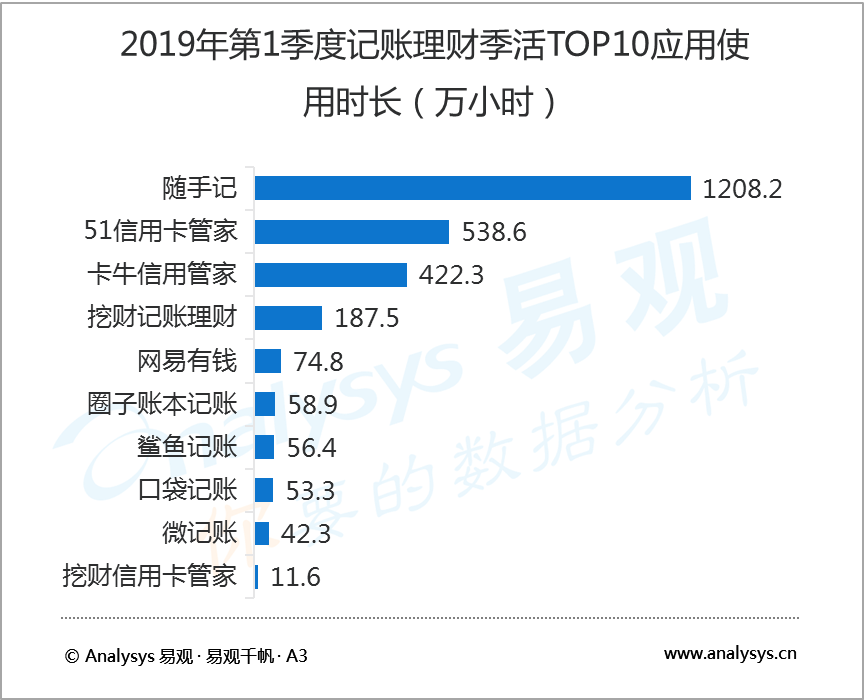 5月24日,知名互聯(lián)網(wǎng)數(shù)據(jù)研究機構(gòu)易觀 Analysys發(fā)布了2019年第1季度記賬理財行業(yè)報告,數(shù)據(jù)顯示,2019年第1季度,在國內(nèi)記賬類應用中,隨手記以1041.7萬活躍用戶規(guī)模蟬聯(lián)榜首,卡牛信用管家和51信用卡管家分別以683.4萬和495.3萬活躍用戶規(guī)模居行業(yè)二、三位。