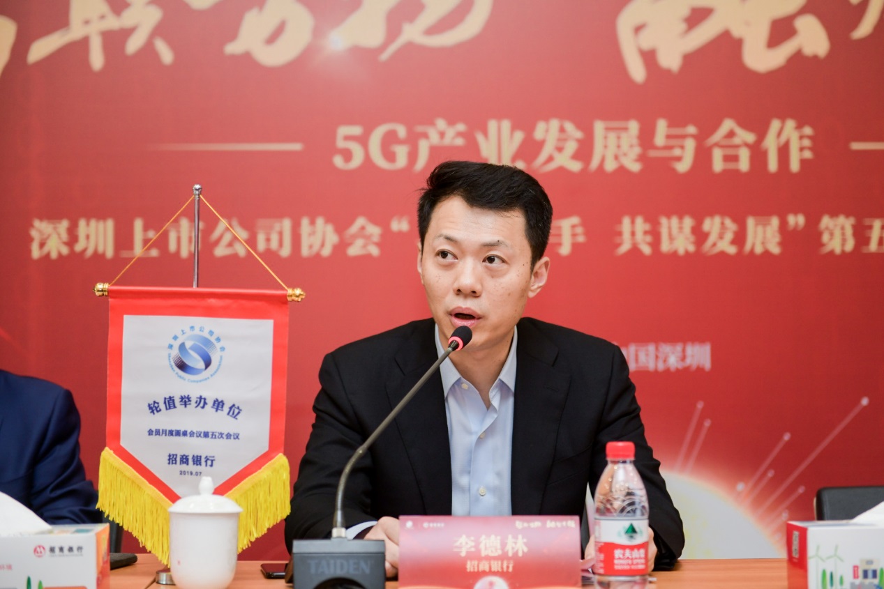 7月11日下午,由深圳上市公司協(xié)會牽頭、招商銀行股份有限公司主辦的“智聯(lián)萬物,融智有招——5G產(chǎn)業(yè)發(fā)展與合作”會員月度圓桌會議第五次會議在招商銀行深圳分行大廈3樓多功能廳成功舉行。深圳市證監(jiān)局處長梁文利、協(xié)會會長麥伯良、協(xié)會執(zhí)行副會長兼秘書長黃鐵軍、招商銀行總行行長助理李德林、總行董事會辦公室主任霍建軍等領導出席了本次活動,本次活動邀請了來自信息技術(shù)、制造、金融、地產(chǎn)等5 G行業(yè)的40家上市公司董事長、總經(jīng)理等60余人參加活動,行業(yè)專家齊聚一堂,共話5G發(fā)展浪潮中的機遇與挑戰(zhàn)。