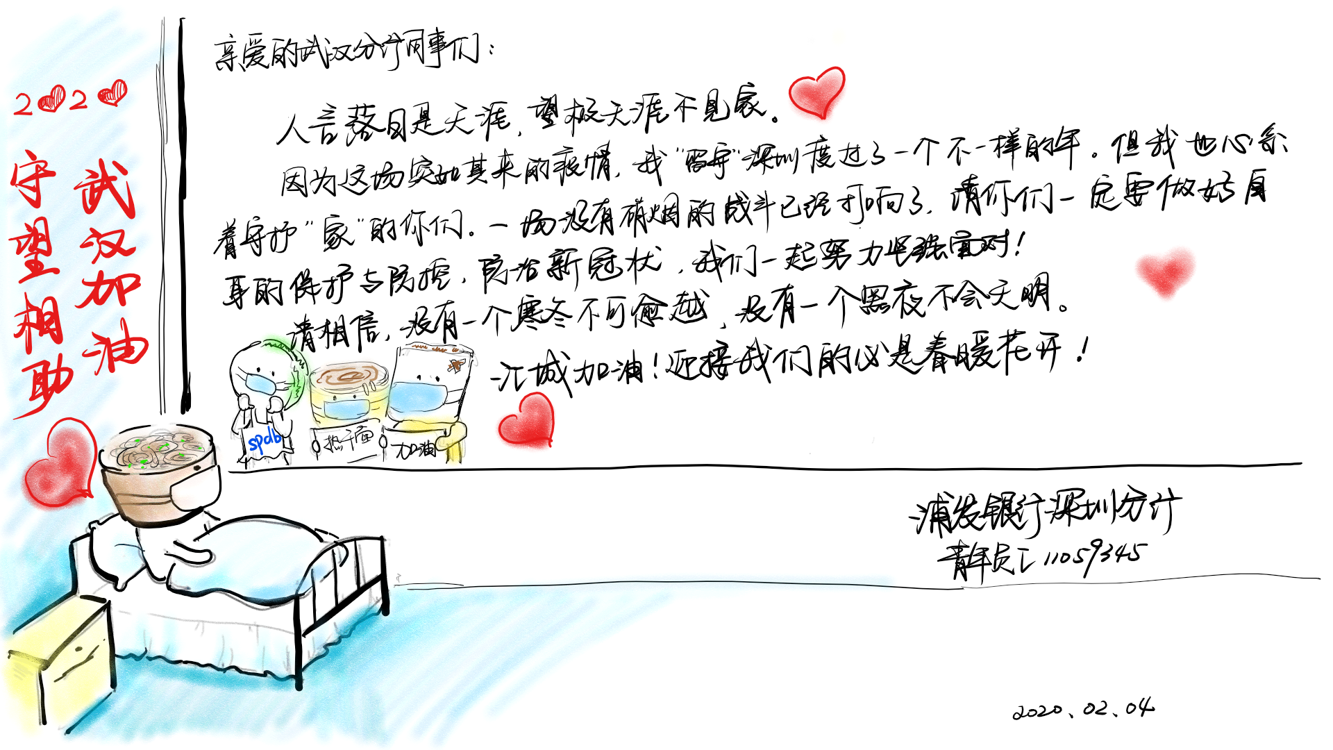 2月3日,浦發(fā)銀行深圳分行團委向全體青年員工發(fā)出了一封倡議書。在倡議書中,該行團委號召廣大團干部、團員青年立即行動,充分發(fā)揮黨的助手和后備軍作用,展現青年突擊隊作為,為堅決打贏疫情防控阻擊戰(zhàn)貢獻力量,并向青年提出三個要求:“堅定信心不迷茫,聽黨指揮勇擔當”、“科學防范不信謠,眾志成城控疫情”、“居家辦公不離崗,服從指揮勇擔當”。當日,浦發(fā)銀行深圳分行發(fā)起了給武漢分行同事寄送家書的活動,該行全體青年手寫家書,圖文并茂、紙短情長,表達了對疫區(qū)“戰(zhàn)友們”最深切的關愛和鼓勵,身體力行做好他們堅強的后盾。