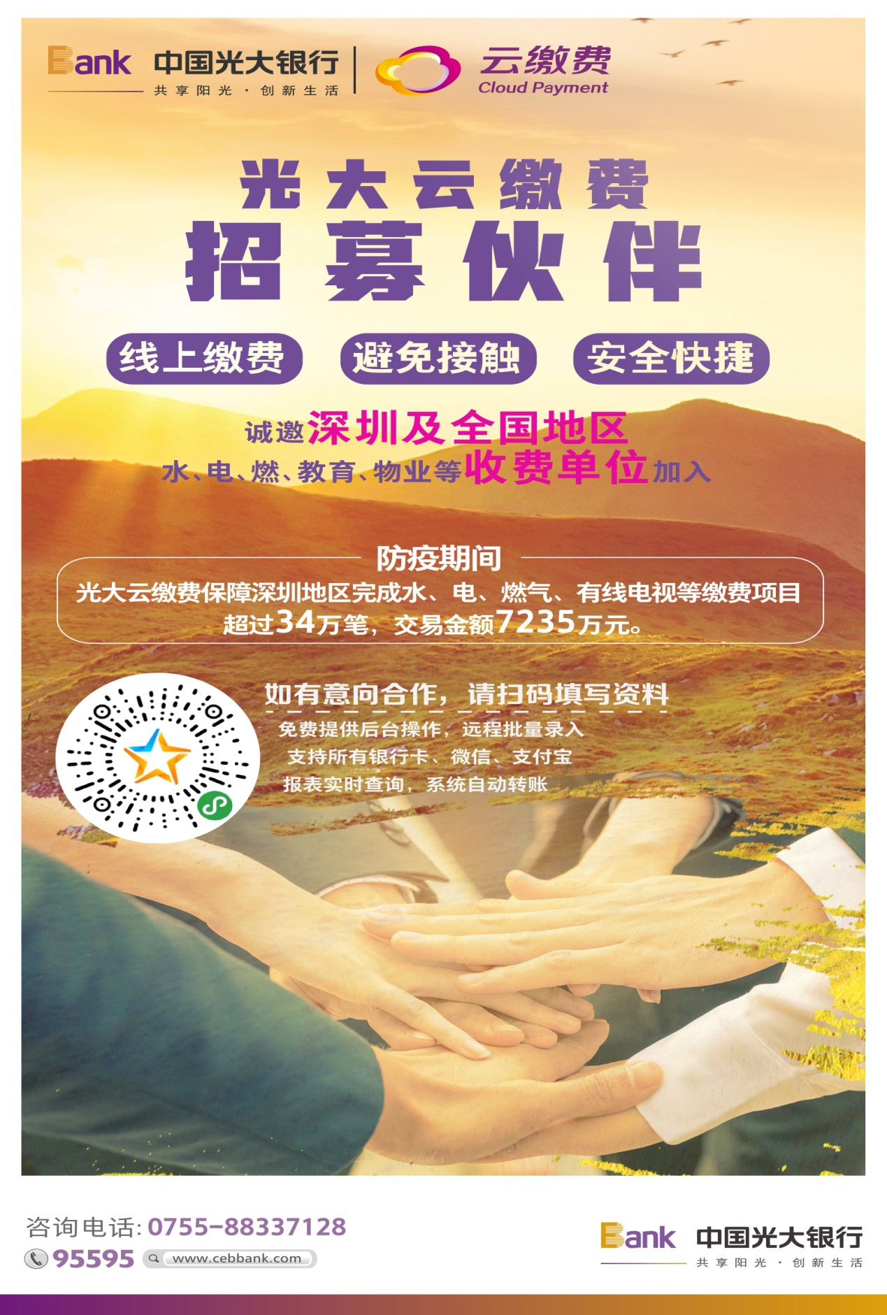 見圳客戶端·深圳新聞網(wǎng)2月26日訊 守望相助,共克時(shí)艱。面對新型冠狀病毒疫情防控的緊張形勢,為有效阻斷病毒傳播渠道,光大銀行深圳分行積極響應(yīng)國家號召,充分發(fā)揮云繳費(fèi)線上便民繳費(fèi)服務(wù)優(yōu)勢,全力保障全國,特別是重點(diǎn)地區(qū)水、電、燃等主要生活繳費(fèi)線上通道穩(wěn)定暢通運(yùn)行,足不出戶,完成各類繳費(fèi),最大限度降低了居民的出行風(fēng)險(xiǎn),全面助力打贏“防疫”阻擊戰(zhàn)。