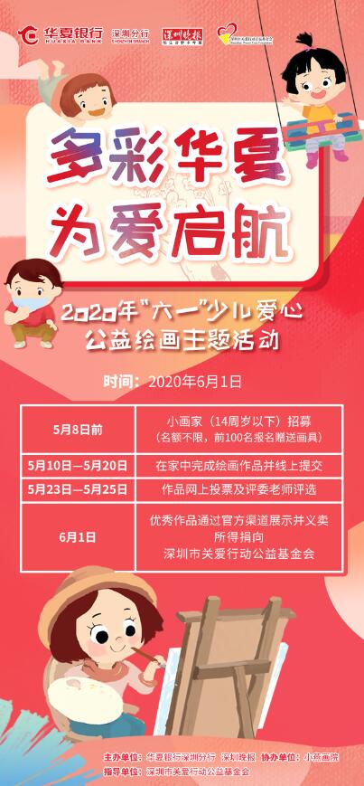 據(jù)了解,該活動(dòng)是由華夏銀行深圳分行攜手深圳晚報(bào)、小燕畫(huà)院開(kāi)展的“多彩華夏為愛(ài)啟航”少兒愛(ài)心公益繪畫(huà)?;顒?dòng)向深圳市民招募小畫(huà)家,邀請(qǐng)他們用手中畫(huà)筆描繪精彩世界。同時(shí),將繪畫(huà)賦予公益與愛(ài)心,評(píng)選出部分優(yōu)秀作品進(jìn)行線上義賣(mài),以點(diǎn)亮地貧兒童的生命之光。