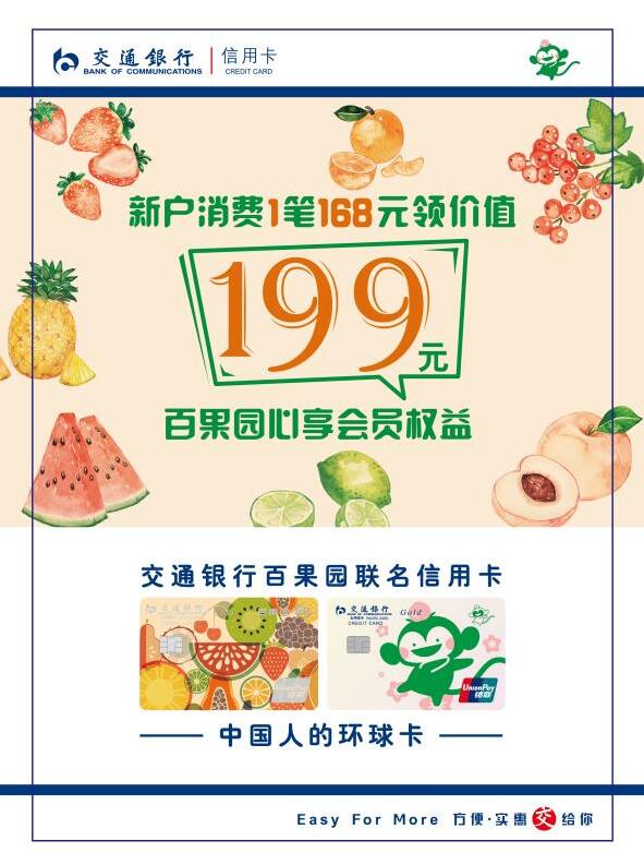 即日起至2020年12月31日,成功核發(fā)指定交通銀行百果園聯(lián)名信用卡主卡的新客戶,自核卡日起45天(含)內(nèi)使用該指定交通銀行信用卡滿足1筆單筆為168元(含)以上的消費(fèi)(不含取現(xiàn)、轉(zhuǎn)賬),即可于核卡日60天內(nèi)(含)至買單吧APP使用5積分換購價值199元的百果心享會員權(quán)益。
