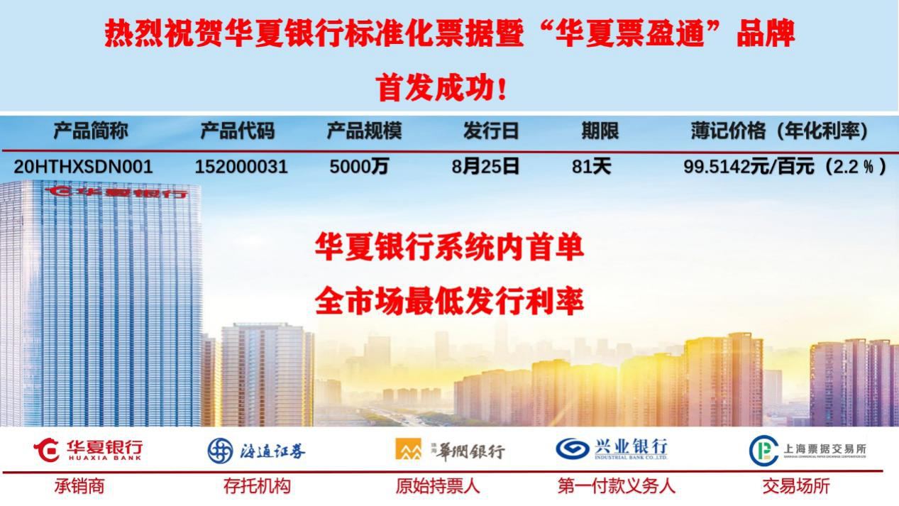 深圳新聞網(wǎng)·見(jiàn)圳客戶端2020年8月25日訊 今日,在深圳特區(qū)成立40周年來(lái)臨之際,記者從華夏銀行深圳分行獲悉,由該行承銷的海通證券華夏票盈通2020年度第一期標(biāo)準(zhǔn)化票據(jù)產(chǎn)品(產(chǎn)品簡(jiǎn)稱:20HTHXSDN001)在該行系統(tǒng)內(nèi)率先成功發(fā)行。本期標(biāo)準(zhǔn)化票據(jù)發(fā)行規(guī)模5000萬(wàn),簿記價(jià)格99.5142元/百元面值(相當(dāng)于年化利率2.2%),發(fā)行利率創(chuàng)全市場(chǎng)可比同類型、同期限產(chǎn)品新低,將以更低的融資成本支持“穩(wěn)企業(yè)保就業(yè)”工作。