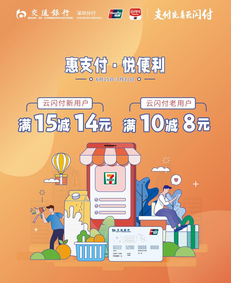 近日,交通銀行深圳分行、云閃付、7-Eleven攜手開展“惠支付,悅便利”活動(dòng),在7-Eleven用銀聯(lián)二維碼支付享立減優(yōu)惠。