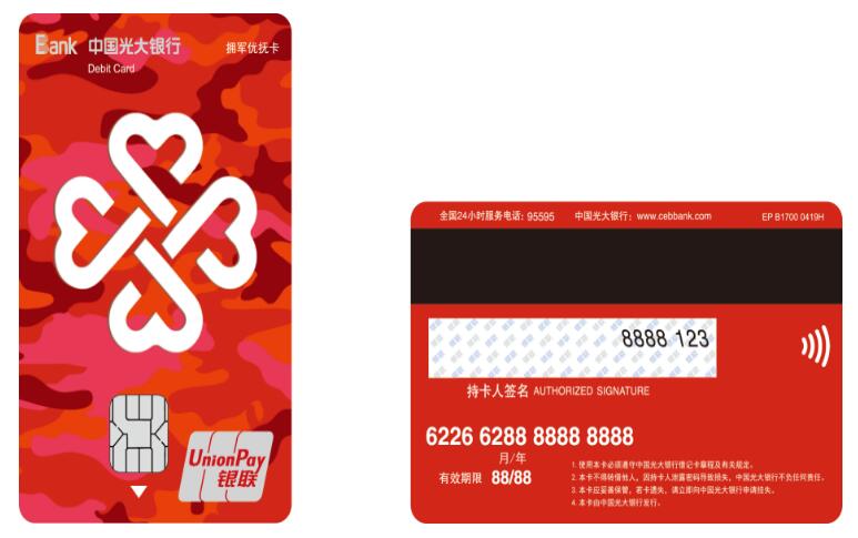 在金融服務(wù)產(chǎn)品方面,光大銀行面向軍人、退役軍人發(fā)行“擁軍優(yōu)撫”專屬聯(lián)名卡,優(yōu)撫對象可以憑軍官證、士兵證、退役證等有效證件在該行營業(yè)網(wǎng)點(diǎn)柜臺辦理賬戶開立并免收卡片工本費(fèi),“擁軍優(yōu)撫”專屬銀行卡在全國統(tǒng)一實(shí)現(xiàn)兩個專屬服務(wù)和十項(xiàng)優(yōu)惠政策。