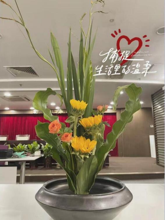 活動(dòng)現(xiàn)場(chǎng),馮老師詳細(xì)介紹了傳統(tǒng)花藝的歷史文化、插花造型、色彩搭配、器具應(yīng)用等基礎(chǔ)知識(shí),從花語(yǔ)寓意、花材修剪、構(gòu)圖等方面深入淺出的講解插花的要點(diǎn)。在悠然的花香浸染間,輕柔的音樂(lè)熏陶中,大家按照馮老師展示的步驟,將花朵、樹(shù)葉精心剪裁、混搭、點(diǎn)綴成束,將一朵一朵鮮花、綠葉錯(cuò)落有致地插在花盆中里,普通的花葉、枝條,經(jīng)過(guò)大家精巧的修飾與加工之后,變成了令人賞心悅目的藝術(shù)品。整個(gè)會(huì)場(chǎng)花香四溢,歡聲笑語(yǔ),充滿了輕松歡快的氛圍。