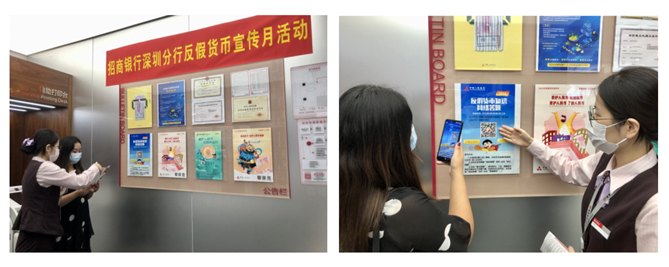 在深圳招行的各營業(yè)網(wǎng)點(diǎn),成立了“支行守衛(wèi)隊(duì)”。依托網(wǎng)點(diǎn)優(yōu)質(zhì)設(shè)施資源,各網(wǎng)點(diǎn)通過懸掛主題宣傳橫幅、LED屏幕滾動(dòng)播放、在廳堂、等候區(qū)、柜臺(tái)等醒目位置擺放反假知識(shí)宣傳折頁和海報(bào)等方式,營造傳統(tǒng)模式宣傳好氛圍。此外,在網(wǎng)點(diǎn)設(shè)立的營業(yè)廳小課堂,現(xiàn)場講解現(xiàn)行流通人民幣的票面知識(shí)、防偽特征及識(shí)別方法;制作“2021海報(bào)答題”海報(bào)引導(dǎo)市民掃碼,開展答題有禮的方式提高大家的參與積極性,寓教于樂開展了反假幣知識(shí)的宣傳。