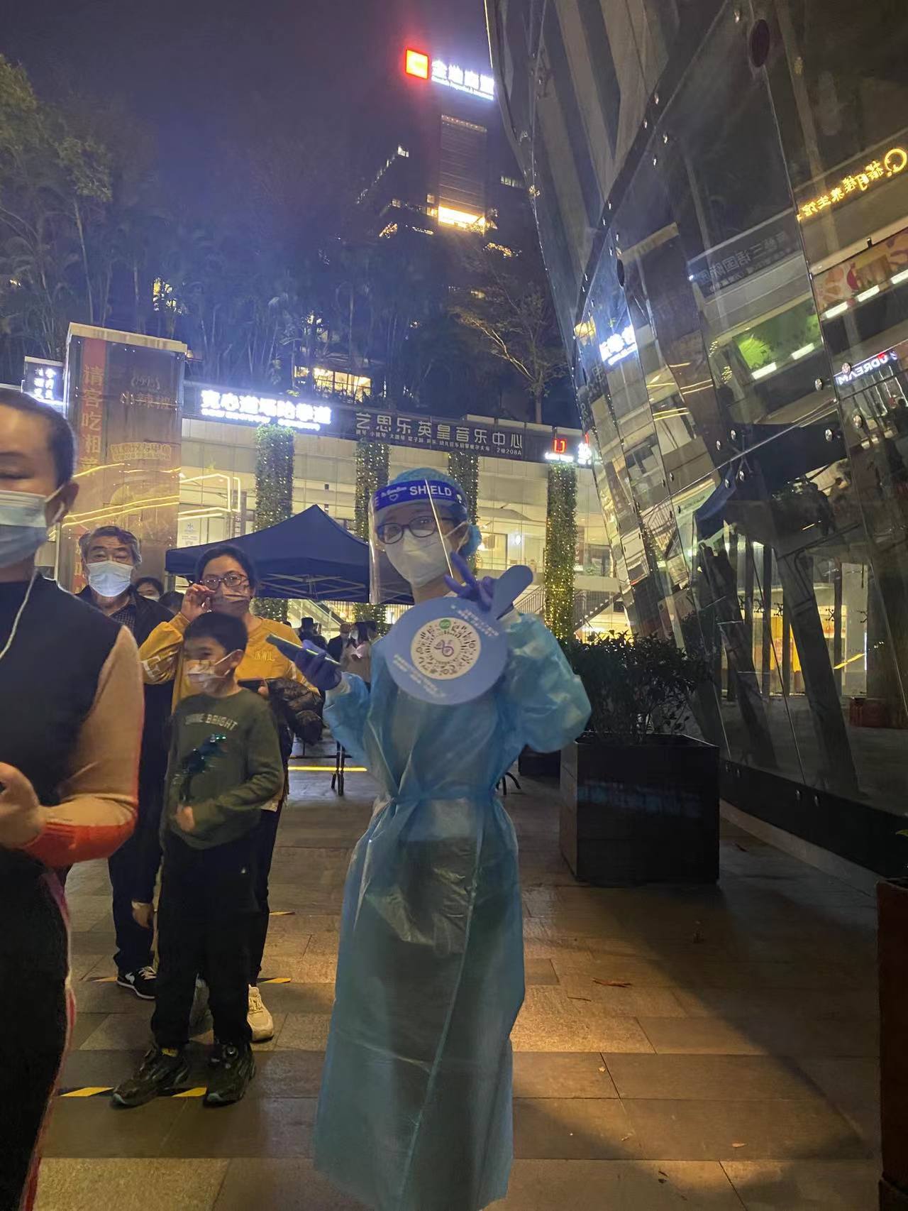 面對本輪疫情的來勢洶洶,新增病例的數(shù)字每天都在持續(xù)增加,許多小區(qū)開始封閉管理。在管控小區(qū)檢測點志愿者奇缺的狀況下,華夏銀行深圳蛇口支行的李宇航迅速報名成為社區(qū)義工。很快,他就穿著防護服,在封閉式管理的小區(qū)內(nèi)幫助核酸檢測秩序維護、指導粵核酸操作。他還主動承擔檢測物資運送的工作,小朋友們總是跑到圍欄外喊他“大白”。他背對著孩子們,自豪地說:“我是華夏小李!”