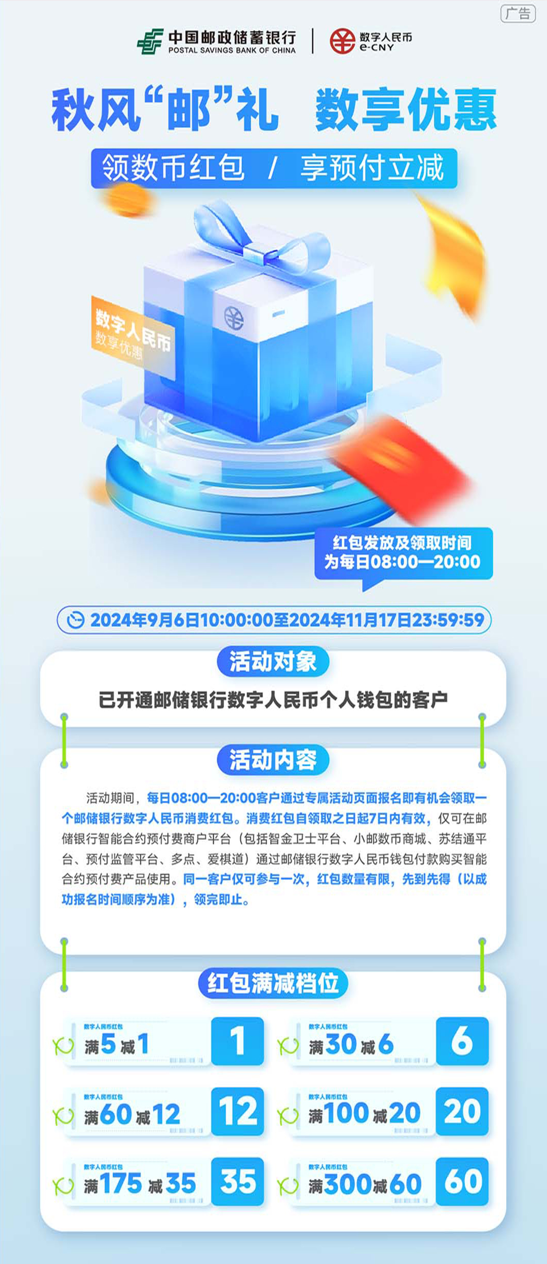 2024年9月6日10:00至2024年11月17日23:59,已開通郵儲銀行數(shù)字人民幣錢包的客戶,活動期間,每日08:00-20:00客戶通過專屬活動頁面報名即有機(jī)會領(lǐng)取一個郵儲銀行數(shù)字人民幣消費紅包。消費紅包自領(lǐng)取之日起7日內(nèi)有效,僅可在郵儲銀行智能合約預(yù)付費商戶平臺(包括智金衛(wèi)士平臺、小郵數(shù)幣商城、蘇結(jié)通平臺、預(yù)付監(jiān)管平臺、多點、愛棋道)通過郵儲銀行數(shù)字人民幣錢包付款購買智能合約預(yù)付費產(chǎn)品使用。同一客戶僅可參與一次,紅包數(shù)量有限,先到先得(以成功報名時間順序為準(zhǔn))領(lǐng)完即止。