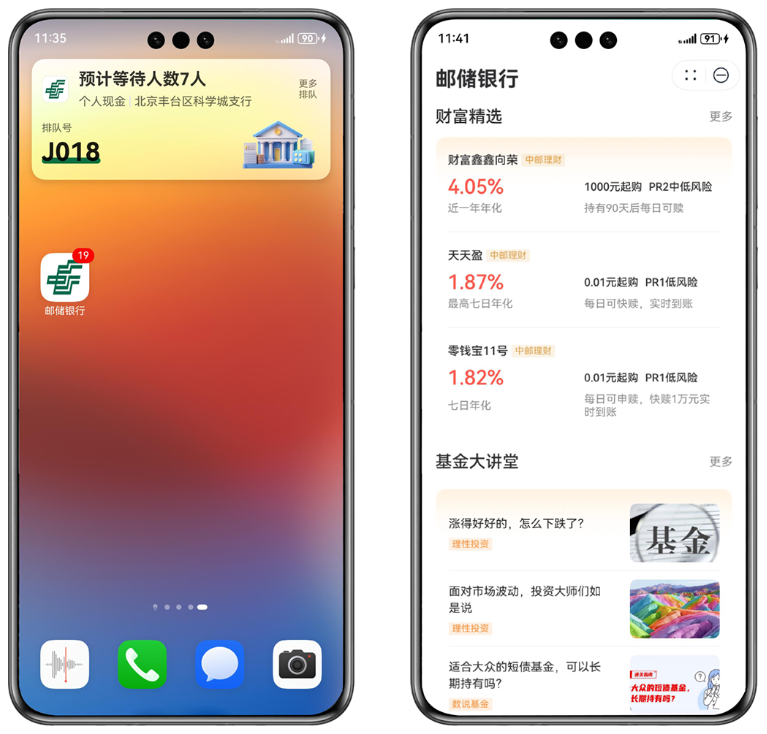 深度擁抱鴻蒙系統(tǒng),打造服務(wù)新體驗。郵儲銀行鴻蒙版手機(jī)銀行、郵儲信用卡App不僅全面覆蓋Android版和IOS版全部功能,為客戶提供“三端”一致的客戶體驗,更借助鴻蒙操作系統(tǒng)的新特性,為客戶打造出多項新體驗。例如,在“實況窗”基礎(chǔ)上實現(xiàn)的網(wǎng)點預(yù)約,可向用戶展示網(wǎng)點排隊信息;基于鴻蒙元服務(wù)的郵儲銀行服務(wù)卡片讓客戶無需啟動App即可瀏覽最新的投資理財產(chǎn)品。