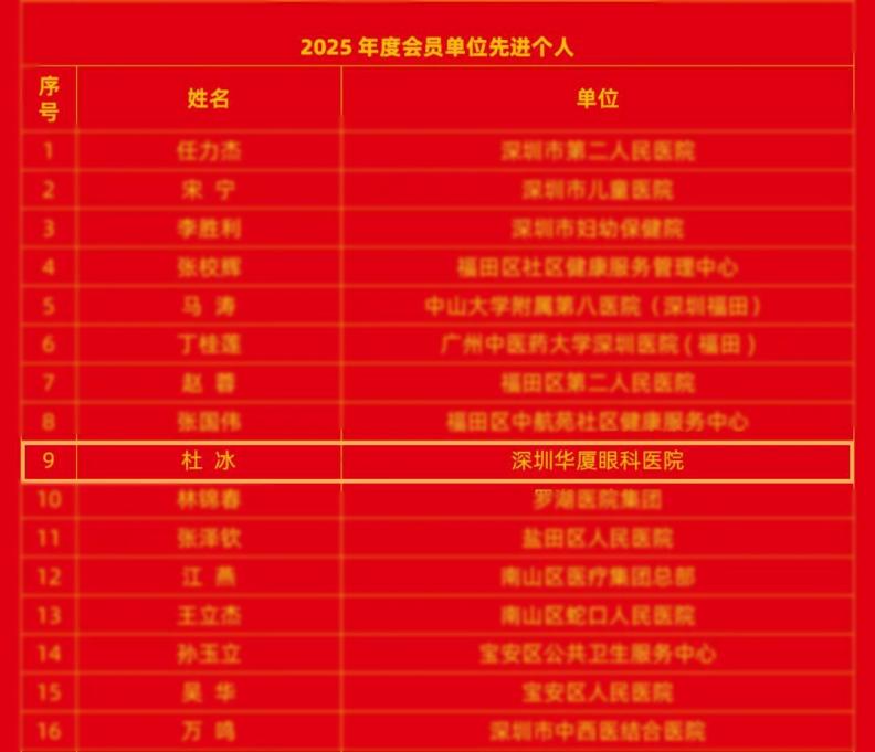 深圳新聞網(wǎng)2026年1月29日訊(記者 林恒鑫)1月27日,深圳市社區(qū)衛(wèi)生協(xié)會公布了2025年度優(yōu)秀分支機(jī)構(gòu)及先進(jìn)個人名單,深圳華廈眼科醫(yī)院副院長杜冰教授因在社康眼健康服務(wù)中的突出表現(xiàn),榮獲“2025年度會員單位先進(jìn)個人”稱號。