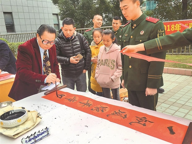 書法家葉自力的“攤位”前人氣也很旺,他主攻“?!弊帧H~自力筆力遒勁,當(dāng)日他書寫的是“智永體”的福字。每每有官兵或家屬過來求字,寫罷,他都善意提醒,“小心點,端平放,小心墨溢出來了?!碑嫾覄⒄窈.嫷哪档ひ埠堋皳屖帧?,供不應(yīng)求。中藝馨書畫院院長黃漢明表示,春節(jié)降至,組織書畫家到軍營里為官兵以及官兵家屬們揮春,既是送祝福也是文化交流?,F(xiàn)場有求字的官兵表示,這樣的活動很好。(記者 劉莎莎 文/圖)