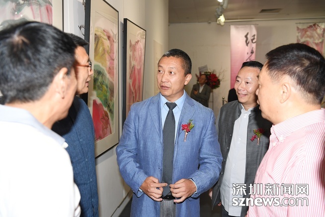 圖為香港中聯(lián)辦宣傳文體部副部長朱挺(右三)出席紀光吉畫展?!?/p>