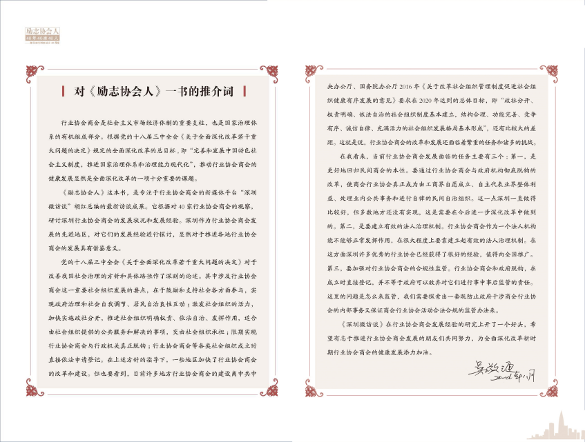 清華大學公益慈善研究院王名教授為此書作序中寫道:感謝深圳,孕育出了中國改革開放和市場經濟發(fā)展中最發(fā)達的協(xié)會;感謝深圳的協(xié)會,為一批優(yōu)秀的協(xié)會人提供了人生和事業(yè)的舞臺。