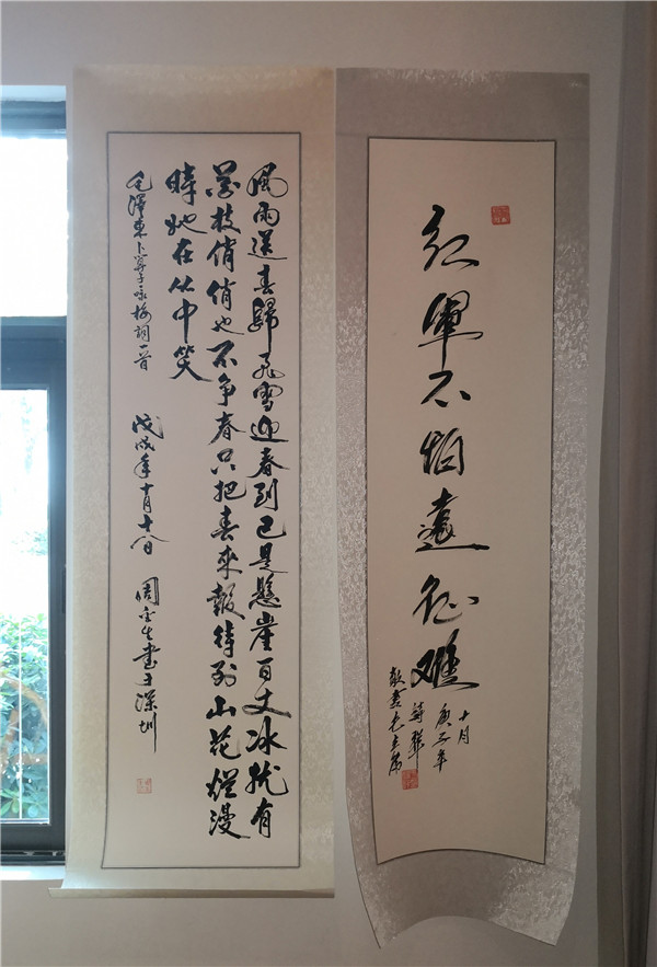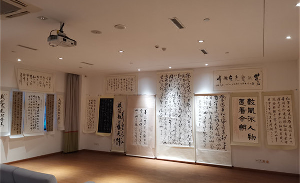 活動開始前,與會嘉賓在服務人員的引導下參觀了《毛澤東詩詞主題書法展》。展廳布置的作品有40余幅,全部內容均為毛澤東同志在革命活動所創(chuàng)作的詩詞,或整篇書寫,或取其意。作品形式以橫幅、斗方、條幅、對聯(lián)為主,字體多為行草,間有楷書隸書,書寫者有企事單位的領導、干部和離退休人員。在這個特殊的日子里,他們以此形式緬懷毛主席的豐功偉績,表達內心對毛澤東同志的敬意和懷念。