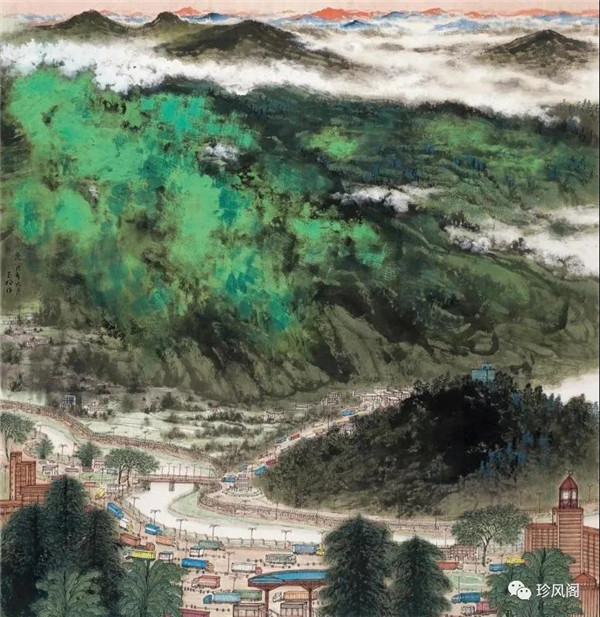 來(lái)自南京而定居于深圳的宋玉明,試圖將新金陵畫(huà)派表現(xiàn)現(xiàn)實(shí)的變革精神用于現(xiàn)代城市山水畫(huà)的探索上。作為新金陵畫(huà)派的第二代畫(huà)家,宋玉明直接承傳了宋文治表現(xiàn)現(xiàn)代太湖人居環(huán)境秀潤(rùn)而精巧的家法,并將此種大山景加小民居的畫(huà)法轉(zhuǎn)用到深圳城市形態(tài)的表現(xiàn)上。這里,我們一方面可以看到深圳作為一個(gè)新興的現(xiàn)代城市借山而筑、注重自然環(huán)境在城市生態(tài)建設(shè)上的積極作用;另一方面,深圳這種與自然相統(tǒng)一的現(xiàn)代化城市建設(shè)理念,也為宋玉明進(jìn)行城市山水畫(huà)創(chuàng)作提供了完美的表現(xiàn)對(duì)象。在《深圳文錦渡》等作品里,我們看到了畫(huà)家巧妙地將城市現(xiàn)代建筑與自然山水融為一體的表現(xiàn)。這些畫(huà)作,大多以勾線渲染的方法表現(xiàn)遠(yuǎn)景中的商用或市政建筑設(shè)施,也因這些建筑被設(shè)置在中遠(yuǎn)景,不僅減少了建筑塑造的困窘,而且突出了這些人居建筑與自然相得益彰的和諧關(guān)系。這些畫(huà)作,從嚴(yán)格的意義上說(shuō),仍然是山水畫(huà),而宋式小散鋒皴以及云煙雨霧的渲染,也為畫(huà)面增添了幽深、恬靜、高雅、平和的意趣與境界。這些畫(huà)作,讓我們所熟悉的城市從一個(gè)相對(duì)遙遠(yuǎn)的視角來(lái)觀看,既因距離產(chǎn)生了一種從未體驗(yàn)過(guò)的美感,也較好地體現(xiàn)了現(xiàn)代城市與自然占位的協(xié)調(diào)統(tǒng)一、舒適宜居的比例關(guān)系。