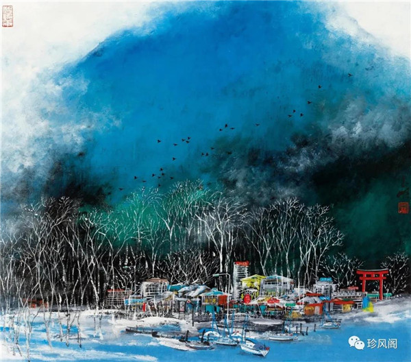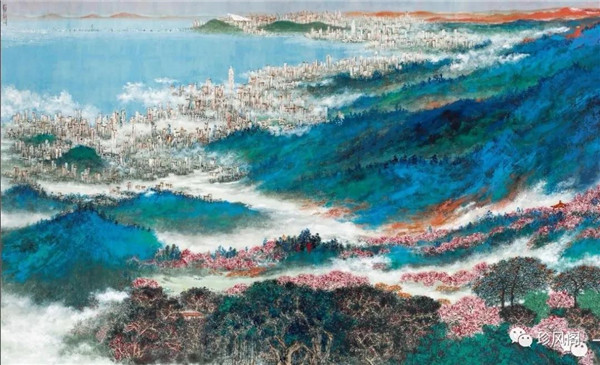 宋玉明從金陵畫(huà)派的新傳統(tǒng)跨越到城市表現(xiàn)的積彩拓墨畫(huà)法,既體現(xiàn)了現(xiàn)代化城市對(duì)于變革傳統(tǒng)的時(shí)代訴求,也體現(xiàn)了他移居深圳后這座新興城市文化對(duì)于他的深刻影響。畢竟,連續(xù)數(shù)屆的深圳水墨雙年展對(duì)于水墨在跨文化中重要作用與表現(xiàn)方法的突破,都給予他至深的思想開(kāi)拓。這表明,城市山水畫(huà)已不單純是用中國(guó)畫(huà)表現(xiàn)城市的命題,而是其中能夠蘊(yùn)含多少城市文化觀念與城市審美的方法,宋玉明對(duì)于城市山水畫(huà)的探索,體現(xiàn)的正是這樣一種對(duì)城市現(xiàn)代文化的思想融合性。而不拘謹(jǐn)于城市一磚一石、一街一道、一房一樓的描繪,著眼于發(fā)揮水墨與彩墨表現(xiàn)的自由性,抑或體現(xiàn)了人性、自然與現(xiàn)代城市共同作用的現(xiàn)代生活方式與人文理想。的確,純粹用中國(guó)畫(huà)或水墨畫(huà)來(lái)探索城市的現(xiàn)代化景觀表現(xiàn),也許只是淺層次的審美需求;而只有當(dāng)把山水畫(huà)作為人與自然和諧統(tǒng)一的觀念表達(dá)植入城市現(xiàn)代化的審美訴求時(shí),城市山水畫(huà)才能真正凸顯出其深刻的美學(xué)價(jià)值。這正是我們從宋玉明的作品里能夠讀解到的他對(duì)于城市山水畫(huà)審美理想的一種勾畫(huà)。