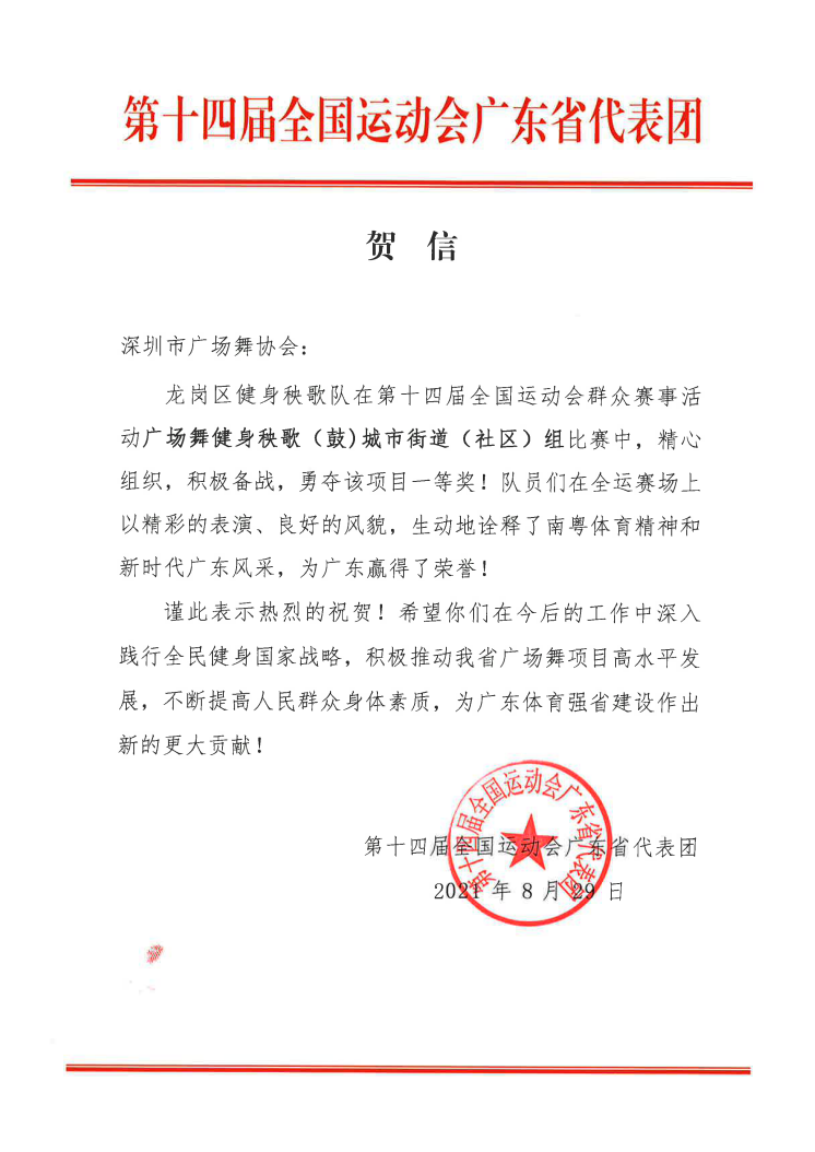 8月29日,第十四屆全國(guó)運(yùn)動(dòng)會(huì)群眾展演廣場(chǎng)舞健身秧歌(鼓)項(xiàng)目公布競(jìng)賽結(jié)果,由深圳市文化廣電旅游體育局和深圳市廣場(chǎng)舞協(xié)會(huì)組織代表廣東省參賽的隊(duì)伍,以一套整齊劃一、剛?cè)岵?jì)的自選套路《我的祖國(guó)》戰(zhàn)勝了多個(gè)省市的傳統(tǒng)秧歌強(qiáng)隊(duì),得到最高名次,獲得了含金量十足的城市街道(社區(qū))組一等獎(jiǎng)。