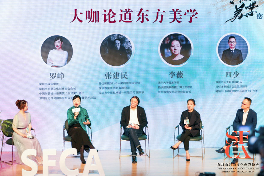 來(lái)自深圳市時(shí)尚創(chuàng)意、工業(yè)設(shè)計(jì)、服裝設(shè)計(jì)、文化傳播、主流媒體等領(lǐng)域的上百位嘉賓與線上觀眾一起見證論壇盛況。中國(guó)文聯(lián)副主席,中國(guó)民間文藝家協(xié)會(huì)主席潘魯生與李槍、張建民、李薇三位主講嘉賓以“東方美學(xué)密碼”為主題,分別從 《東方美學(xué)密碼的物質(zhì)化轉(zhuǎn)換》《東方美學(xué)與品牌創(chuàng)新實(shí)踐之路》《設(shè)計(jì)創(chuàng)作中的“道與器”》三個(gè)角度,分享了東方美學(xué)在當(dāng)代藝術(shù)界、工業(yè)設(shè)計(jì)、服裝設(shè)計(jì)等領(lǐng)域以及現(xiàn)實(shí)生活中的應(yīng)用和未來(lái)可能性。公眾不僅從名師大家的思想與洞見中感知東方美學(xué)綿延不絕的生命力,也找到了東方美學(xué)能夠引領(lǐng)世界新時(shí)尚的“密碼”所在。