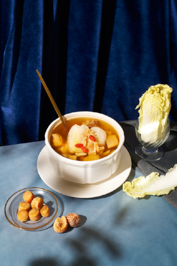 瑤柱菜膽燉土豬展湯,80頭干瑤柱經過發(fā)泡,和優(yōu)選食材的土豬肉,娃娃菜一塊入燙盅燉6小時。水甘味甜,有滋補清潤作用。