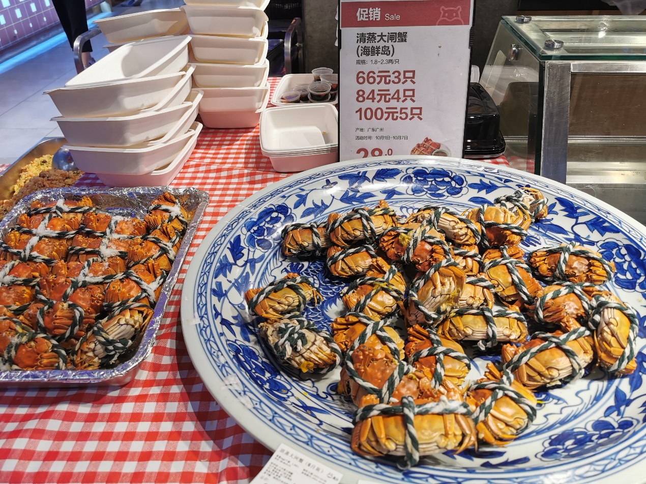 其中爆款非大閘蟹莫屬。民間有個(gè)講究:“九雌十雄”,農(nóng)歷九月吃母的大閘蟹,農(nóng)歷十月吃公的,因?yàn)槟菚r(shí)候大閘蟹的蟹黃和蟹膏是最好的。黃金周期間,盒馬深圳大閘蟹銷量與9月相比增長六倍。其中最受歡迎的是2兩重的母蟹,盒馬皇庭廣場(chǎng)店假期里試過一天賣出近兩千只大閘蟹。