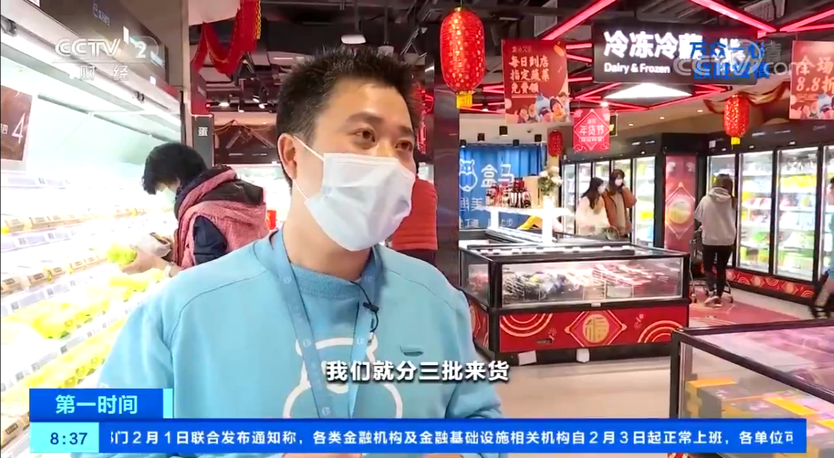 “排面要整理一下?!眮碜院钡溺娞炱绞呛旭R鮮生超市員工,他告訴記者,春節(jié)前,因?yàn)殛懤m(xù)看到疫情的消息,他和愛人取消了返鄉(xiāng)的車票,但這也是他這么多年來所經(jīng)歷的,最不尋常的一個(gè)。初一初二休息的鐘天平,大年初三就碰上了搶購?!邦櫩团砰L隊(duì),從9點(diǎn)鐘排隊(duì)排到1點(diǎn)鐘左右,貨架上的蔬菜、肉以及禽蛋奶,甚至是油米面都被一掃而空?!?/p>