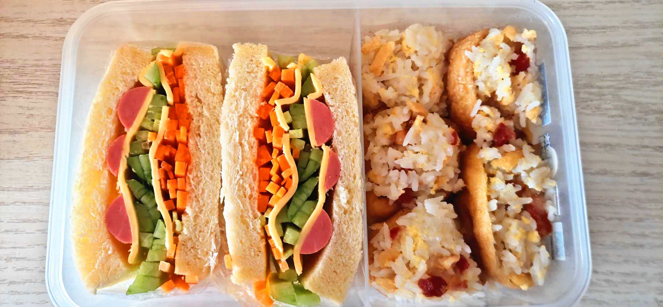 胡蘿卜和青瓜切絲,臘腸切成?;鹜饶c對半切,準備面包四片,芝士片四片。拿一張保鮮膜,將一片面包片放在上面,然后依次擺上胡蘿卜、芝士片、青瓜片和火腿腸片,再放上一片面包片,用保鮮膜包起來。包緊,然后從中間切成兩半,裝在飯盒里即可。將臘腸粒放在剩飯里,加鹽和醬油一起拌均后,再放進掏空的豆腐泡里。整個豆腐泡隔水蒸大約十分鐘左右,再裝在飯盒就可以了。