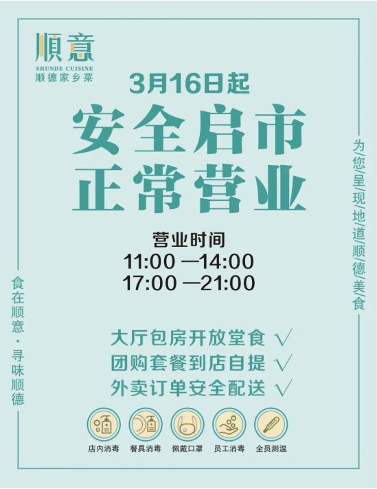 近日,記者發(fā)現(xiàn),深圳人喜愛的順德菜之一順意順德家鄉(xiāng)菜深圳3家門店福華一路店、車公廟店、科技生態(tài)園店已于3月16日全面恢復正常營業(yè),同時,大廳包房均可開放堂食,外賣服務同樣進行中,不方便到店消費的也可以叫外賣。