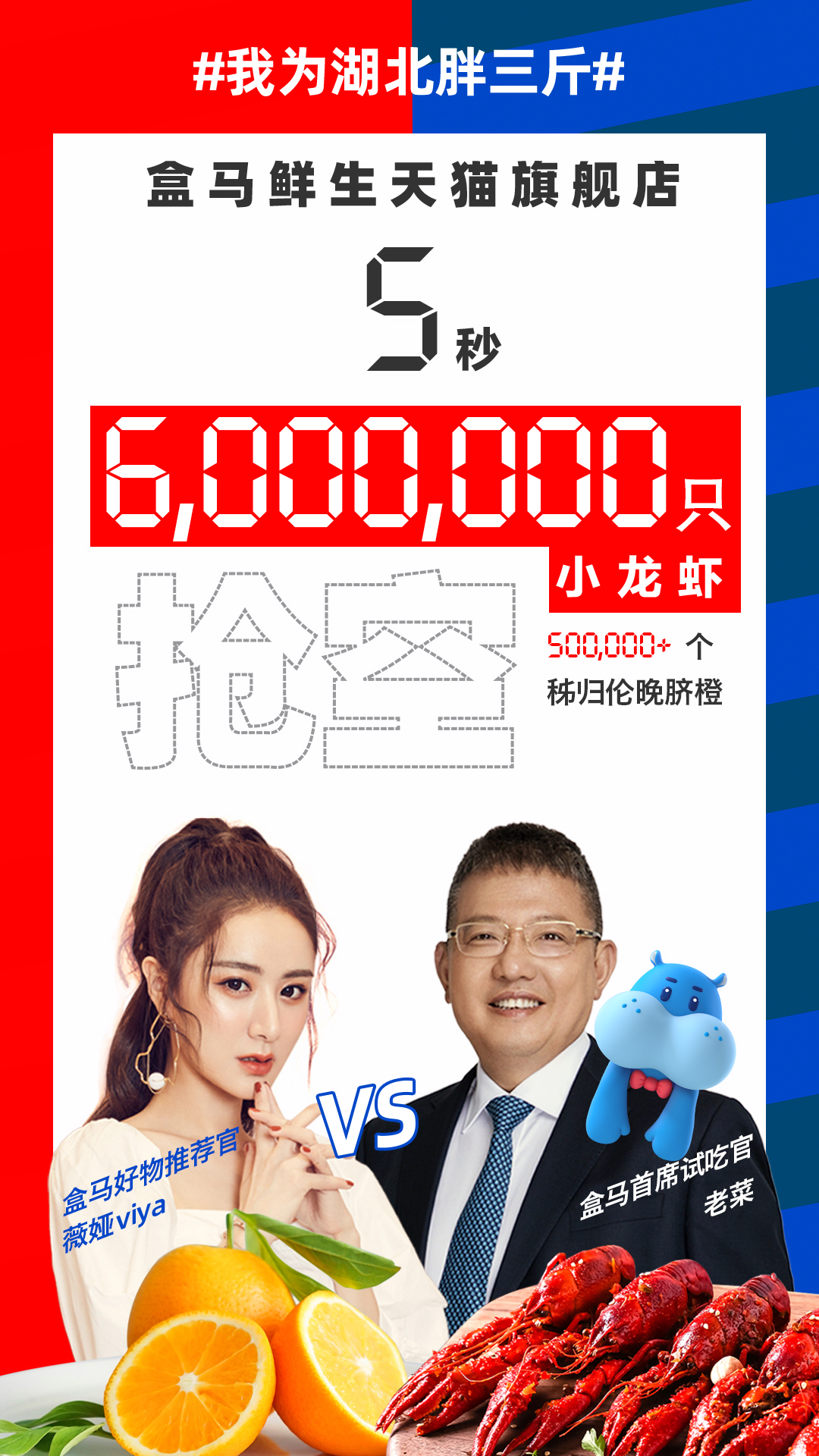 4月21日晚,盒馬總裁侯毅(花名老菜)做客淘寶薇婭直播間,為湖北農(nóng)產(chǎn)品帶貨。侯毅直播時長半小時,但僅用時5秒鐘,盒馬鮮生天貓旗艦店內(nèi),網(wǎng)友就買光了600萬只湖北小龍蝦。與小龍蝦一起賣空的還有秭歸倫晚臍橙。25萬斤倫晚,3秒被搶光。超強的帶貨能力,讓兩人獲封“菜見婭”組合。