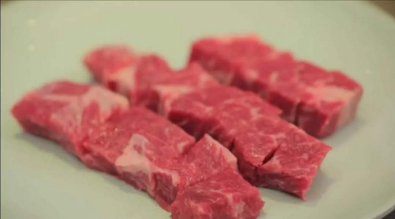 1、將牛扒切成方塊狀,長寬大約在1.5cm左右;