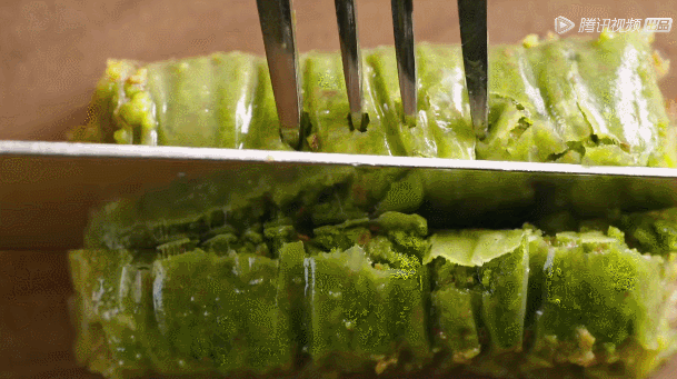 奶酪加滿滿的開心果碎,上下覆蓋二十層薄如蟬翼的面皮,小伙子苦苦練習(xí)七年搟面皮,十幾張面皮同時搟壓,每張的厚度不超過0.1毫米,