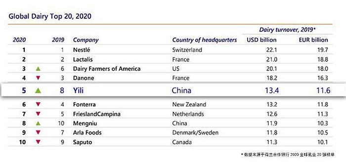 中新網(wǎng)9月1日電 近日,中國(guó)乳業(yè)曝出一個(gè)令國(guó)人欣喜的消息:在荷蘭合作銀行公布的“2020年全球乳業(yè)20強(qiáng)”排名中,中國(guó)伊利集團(tuán)排名飆升至第五,成功躋身全球乳業(yè)五強(qiáng)。