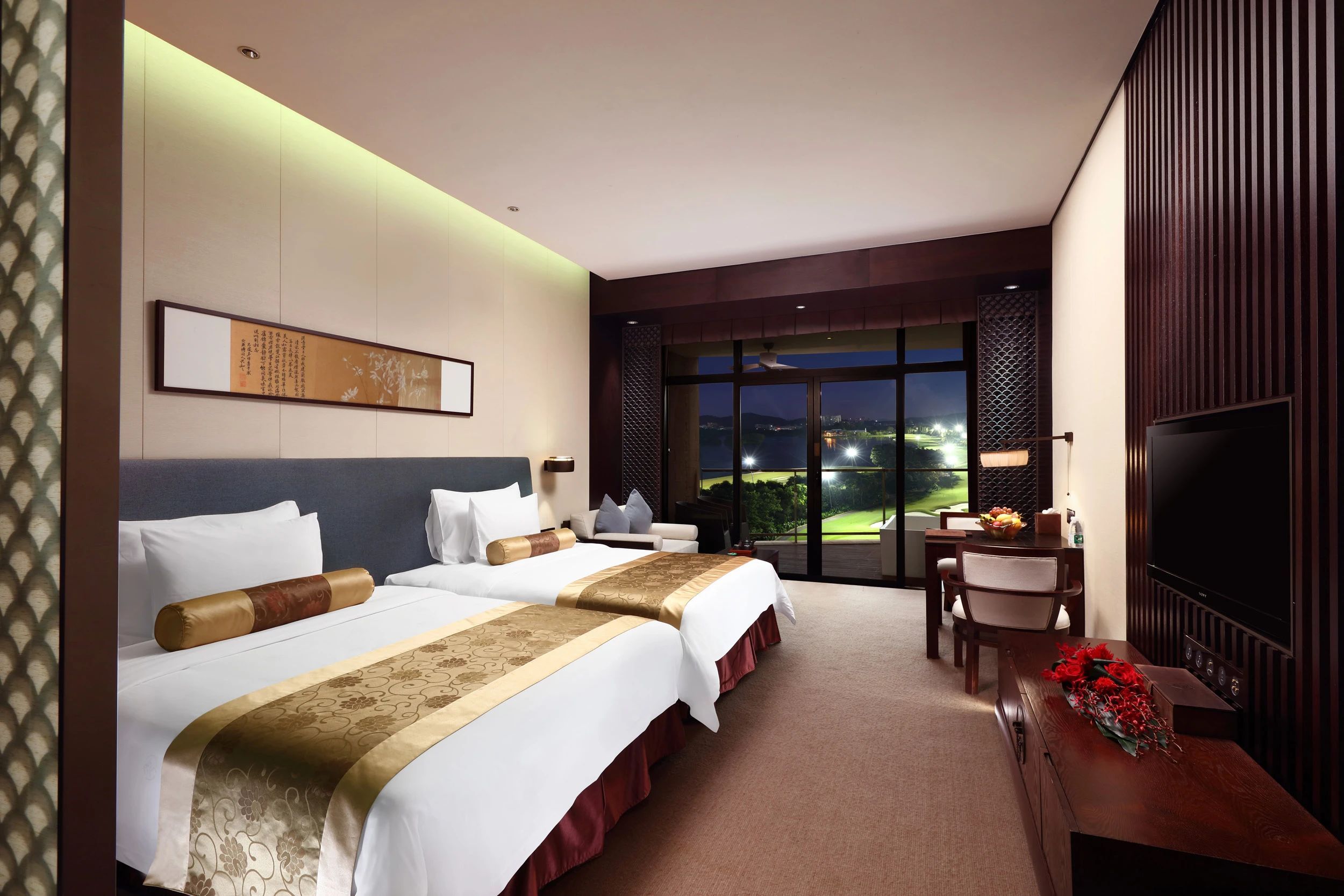 我們這次下榻的是42㎡的豪華客房,以中國(guó)風(fēng)為美學(xué)設(shè)計(jì),床頭是韻味十足的古風(fēng)字畫,中式銅鎖、陶瓷擺件……藝術(shù)品無(wú)處不在。