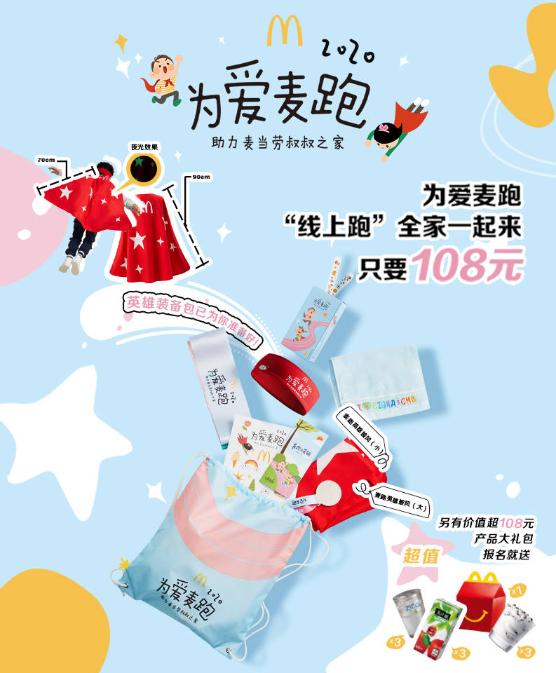 不同于往年大規(guī)模的線下親子跑,今年“為愛麥跑”采用創(chuàng)新的“線上愛心親子跑”,提供裝備包和任務(wù)盒,讓參跑家庭用不聚集、無接觸的形式參與跑步,享受親子時光,并支持麥當(dāng)勞叔叔之家?!盀閻埯溑堋惫膭顓⑴苷甙l(fā)揮創(chuàng)意,以家庭為單位設(shè)定自己的路線和距離,例如以自己的家為起點(diǎn),將終點(diǎn)設(shè)在附近的麥當(dāng)勞餐廳。