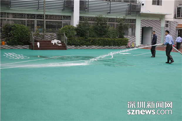 羅湖螺嶺外國語實(shí)驗(yàn)學(xué)校二部通過沖水的方式,清除跑道的異味