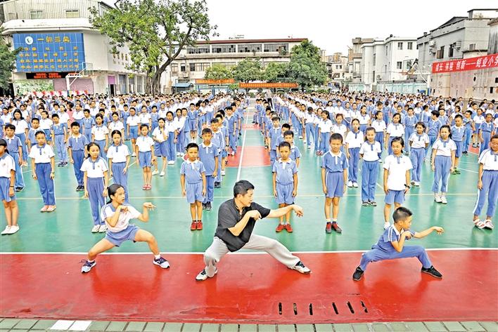 當天,利用課間陽光體育的時間,蠔業(yè)小學1000余名學生在校內饒有興趣地接受了華林派武術操的教學,華林螳螂拳代表性傳承人冼潤長師傅詳細地講解了武術操,并實地示范。華林派武術操是“華林螳螂拳”代表性傳承人冼潤長針對青少年所創(chuàng)編,融入了螳螂拳的武術元素,深受學生的歡迎。活動不僅讓孩子深入了解優(yōu)秀傳統(tǒng)文化,還讓孩子“武”起來,益于舒緩學習壓力。